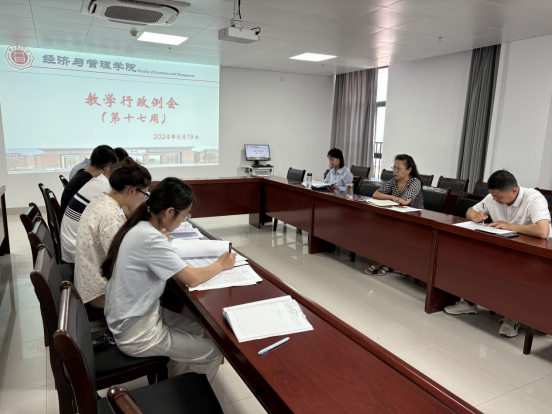 2024年6月19日,经济管理公司在新行政楼725召开第十七周教学行政例会,会议由经理吴玲主持,副经理秦品德、经理助理张珊、实训中心主任及各教研室主任参加会议。