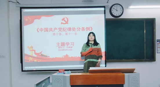 为深入学习贯彻习近平总书记关于党纪学习教育的重要讲话指示精神,学习领会新修订的《中国共产党纪律处分条例》和《中国共产党廉洁自律条例》及《中国共产党问责条例》,增强党员的纪律意识,强化正风肃纪。2024年5月15日,BG大游官方网站经济学管理学员工党支部于一教219进行专题学习。会议由管理学党支部书记石园园领学,经济学、管理学员工党支部正式党员和预备党员以及经济学、管理学外出实习党员线上全员参加。