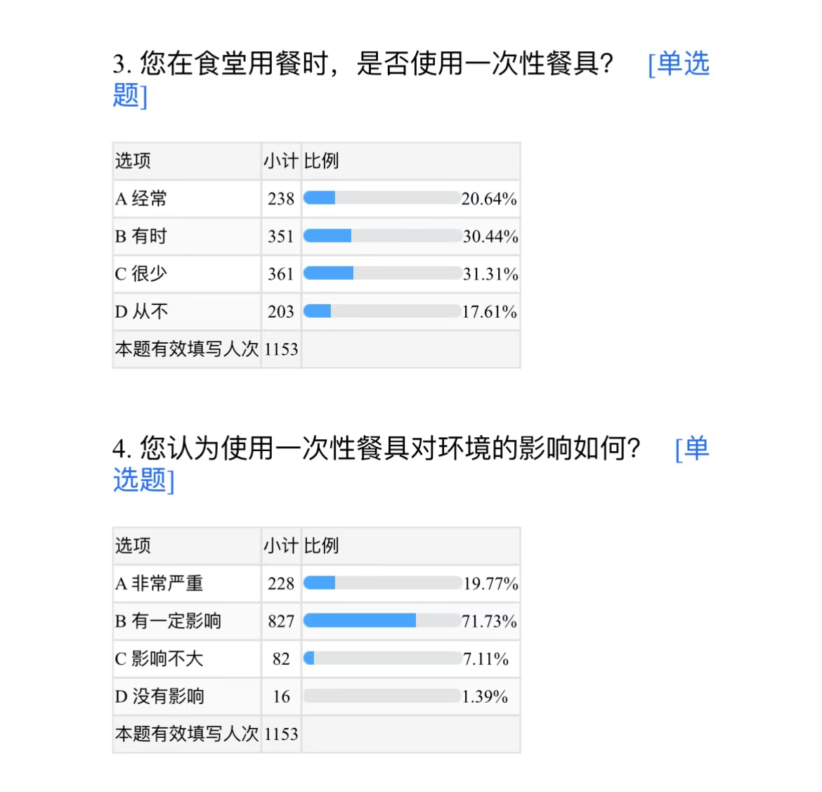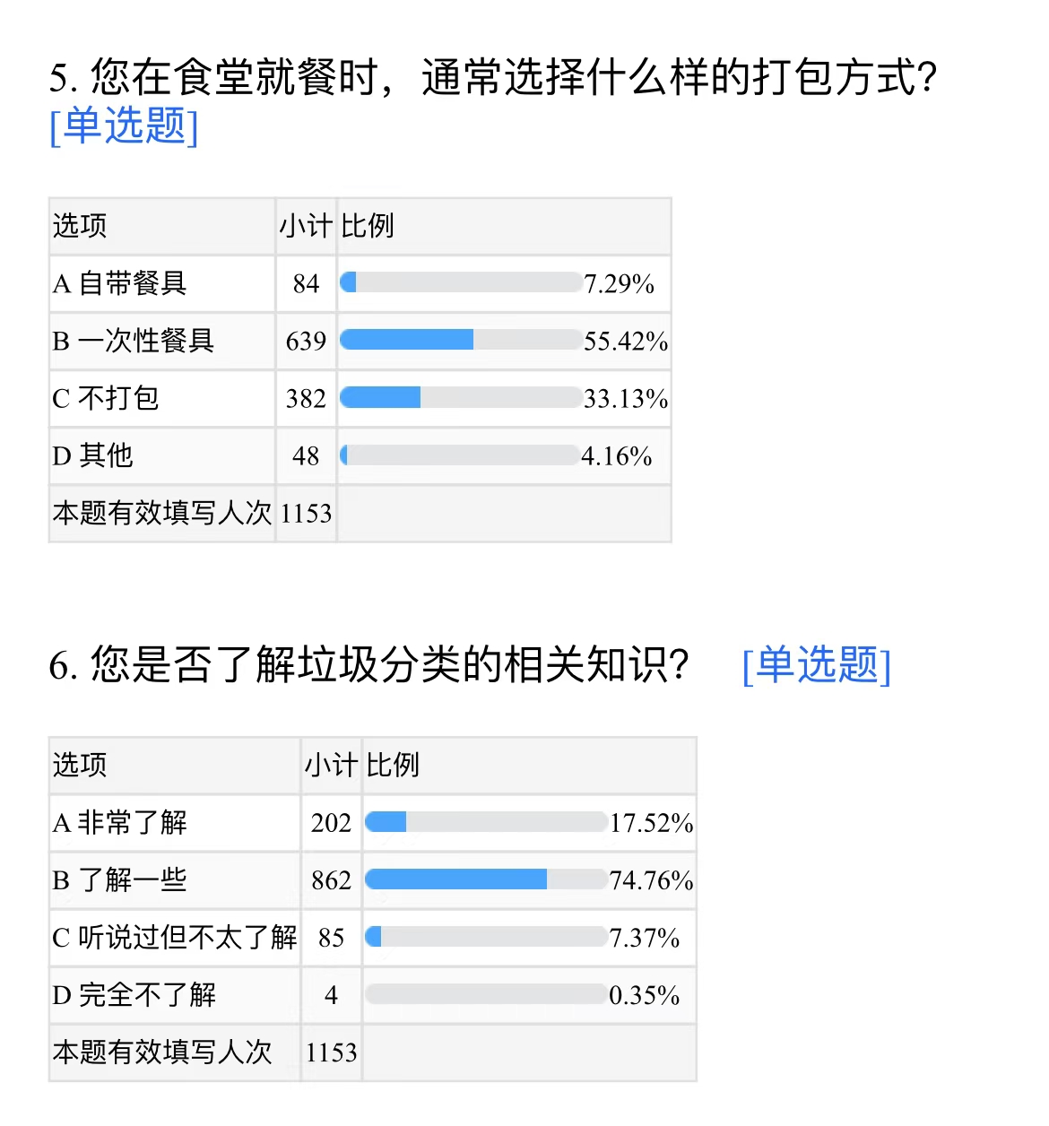 为了更全面地了解问题,辅导员们还组织志愿者发放了调查问卷,深入了解员工的环保意识,共收集到1153份有效问卷。问卷结果显示,尽管大部分员工对环保有一定的认识,但在日常实践中,如减少一次性餐具使用、正确分类垃圾等方面,仍有待提升。