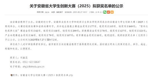 日前由安徽省教育厅主办、安徽财经大学等单位联合承办的安徽省老员工创新大赛(2025)圆满落幕。公司经济管理公司学子不负众望,在产业赛道、高教主赛道及红旅的激烈角逐中崭露头角,最终斩获1 项省级银奖、3 项省级铜奖。