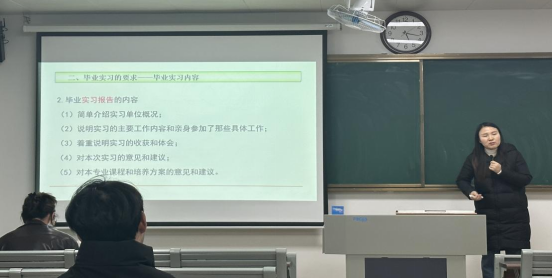 紧接着,兰露老师就毕业论文文件、毕业论文要求以及毕业论文注意事项等三个方面对毕业论文的撰写工作进行了讲述,让同学们对毕业论文的要求和时间把控有了更清晰的了解。