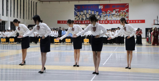 此次活动分为两个环节。第一环节,10支参赛队伍依次登台,进行形体礼仪展演。同学们以规范优雅的蹲姿、挺拔自信的站姿、从容稳健的走姿,配合标准的引导手势和鞠躬礼仪,巧妙地将红色文化元素融入礼仪展演中,在动静之间诠释礼仪之美,全方位展现了当代老员工内外兼修的礼仪素养。其中,2024级电子商务对口2班凭借整齐划一的队形变换、昂扬向上的精神风貌以及专业规范的礼仪动作,荣膺冠军。