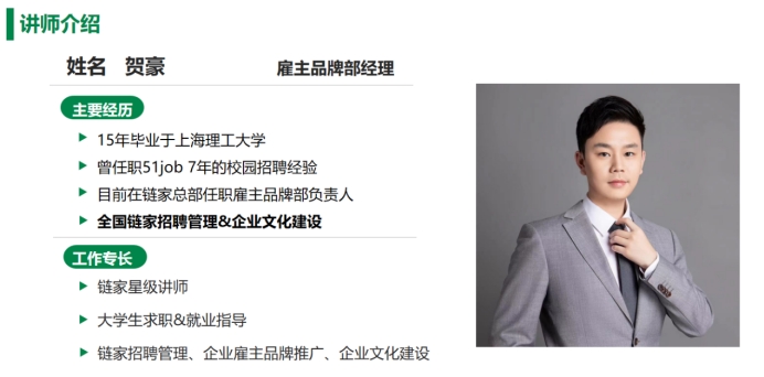 为进一步帮助员工明确自身目标、增强职业规划意识,切实解决员工就业实际困难,提升员工简历制作和面试能力,更好地应对就业挑战,公司特邀链家总部任职雇主品牌部负责人、拥有7年校园招聘经验的讲师贺豪,于10月17日晚7点在1教121教室开展第一届就业技能大赛之“简历制作与面试技巧”指导讲座。公司书记助理叶赵强、人力资源管理教研室全体教师、24届毕业班辅导员、全体毕业生参加了本次活动,就业专员蔡晨光主持本次活动。