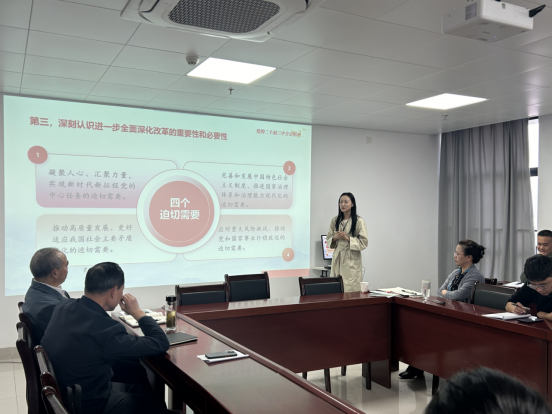 各个支部按照总支的部署定期进行理论学习,优选学习内容,实施“跟进学习”。在教工支部的扩大学习会议上,教工支部宣传委员李莜莜带领全体教师认真学习“习近平总书记在省部级主要领导干部学习贯彻党的二十届三中全会精神专题研讨班开班式上发表重要讲话”精神,讲话里强调了全面准确理解党的二十届三中全会精神,坚定改革信心、把准改革方向、强化改革责任、汇聚改革合力,推动各项改革举措精准落地见效,增强政治责任感、历史使命感,以攻坚克难、迎难而上的政治勇气直面问题。吴玲要求各位教师党员和积极分子一定要认真习近平总书记的讲话精神,务实践行深化改革举措,积极投身公司产品改革实践,为公司的高质量发展做出自己的贡献。